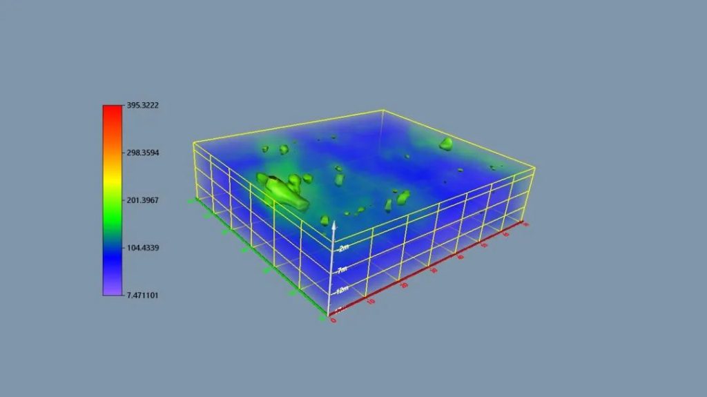 在工地现场,每组勘探使用6个模块同时工作,使用专用地质数据分析软件处理,得到位置、深度与反射系数、主频的对应关系,最后输出二维地震反射波成像成果图与三维地球物理模型。输出图像总体上呈蓝色低频背景,表明地下整体相对均匀,未发现新的管线及地下设施。测区北侧区域局部有绿色高频异常,推测为人工建筑物残余的反应。